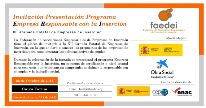 La Federación de Asociaciones Empresariales de Empresas de Inserción (FAEDEI) organiza el 22 de octubre en el CaixaForum de Madrid las XII Jornadas Estatales de Empresas de Inserción, bajo el lema de ‘Empresas responsables con la inserción’. Leer más >>